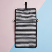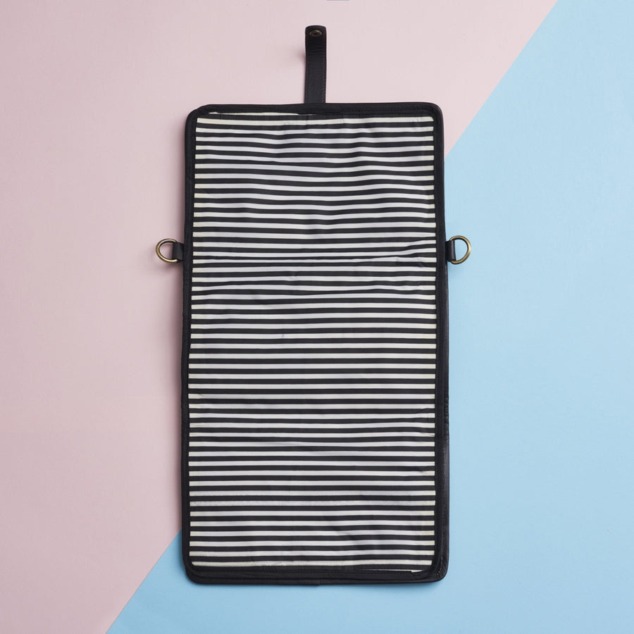 The stripey, water-resistant change mat is quick to velcro in and out and there are 2 detachable straps - one longer one so you can carry it across the body and a shorter one so you carry it over your shoulder or hook it over your buggy. It also looks great carried as a simple clutch bag.