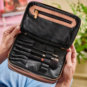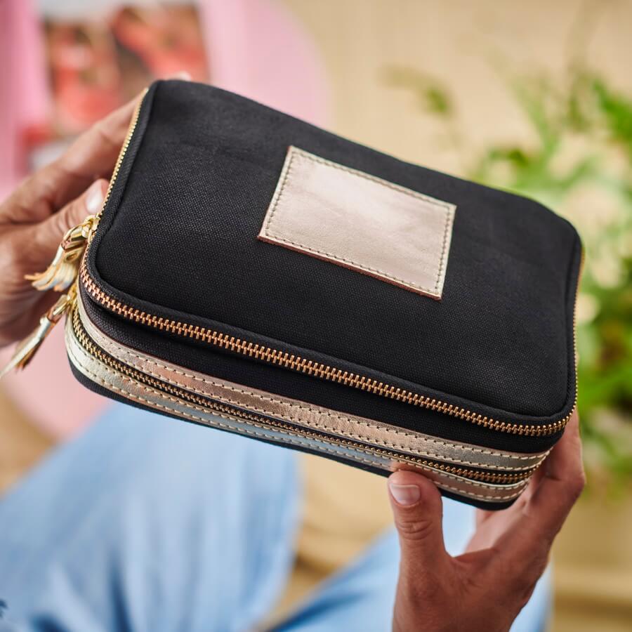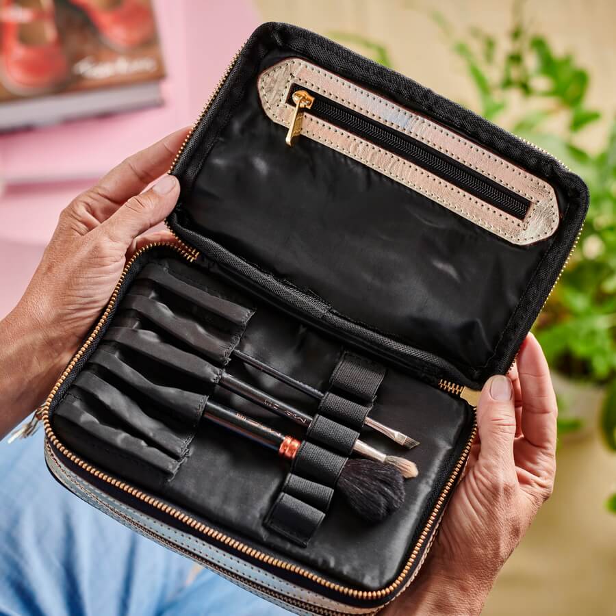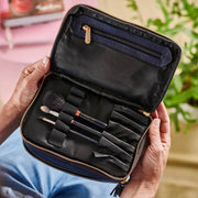 We hand-craft each one high quality canvas and are signature leathers to make it look and feel luxurious. Inside there are 2 zip up sections - one with plenty of space for make-up and one with elasticated straps for make-up brushes.