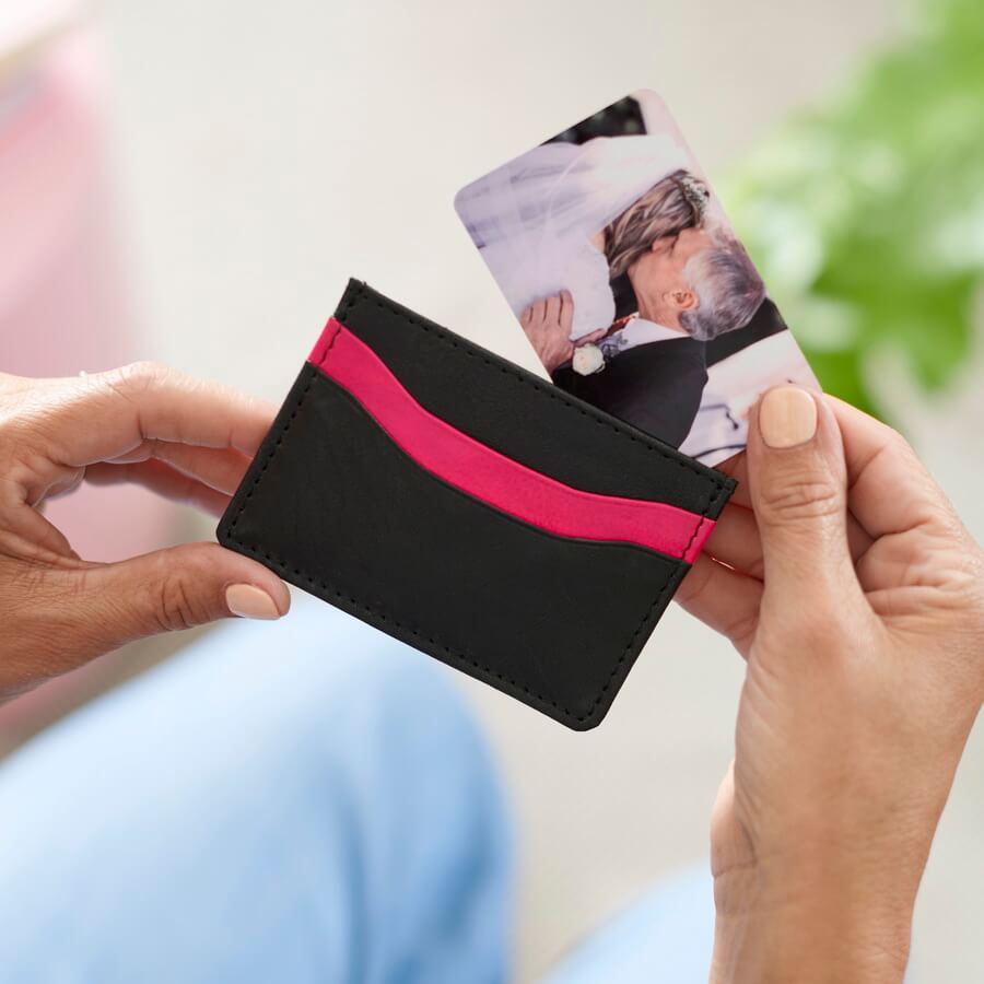 A gorgeous leather card holder, which is ideal to keep cards safe in style. They come with a metal photo card which really makes them into an extra special gift.