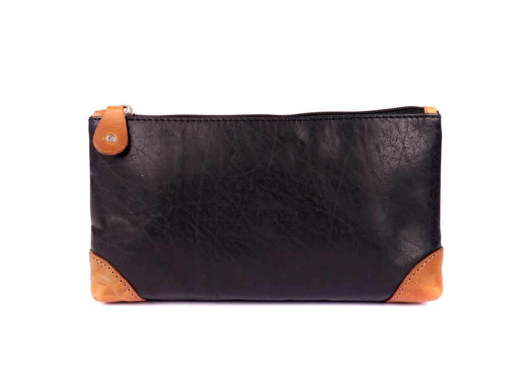 The soft leather outer is lined with a waterproof black lining and theres a zip poocket inside too.