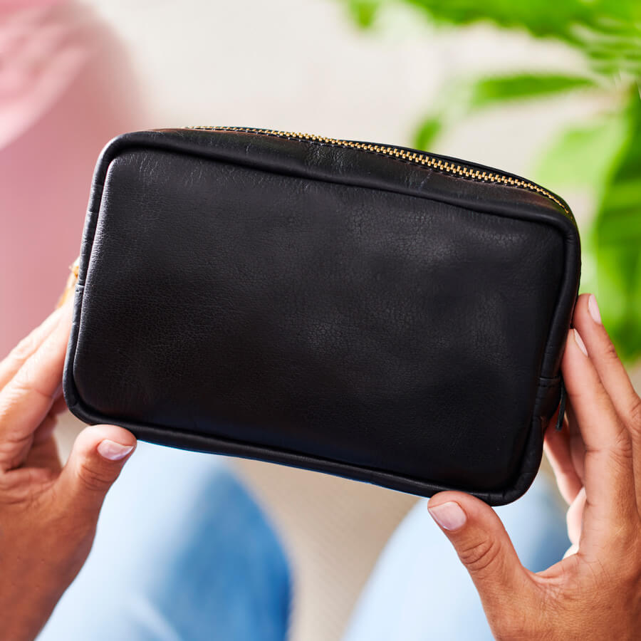This leather make-up bag is perfect for storing all your cosmetic essentials in one stylish and durable place. Made from high-quality leather, it provides reliable protection for your make-up while on the go.