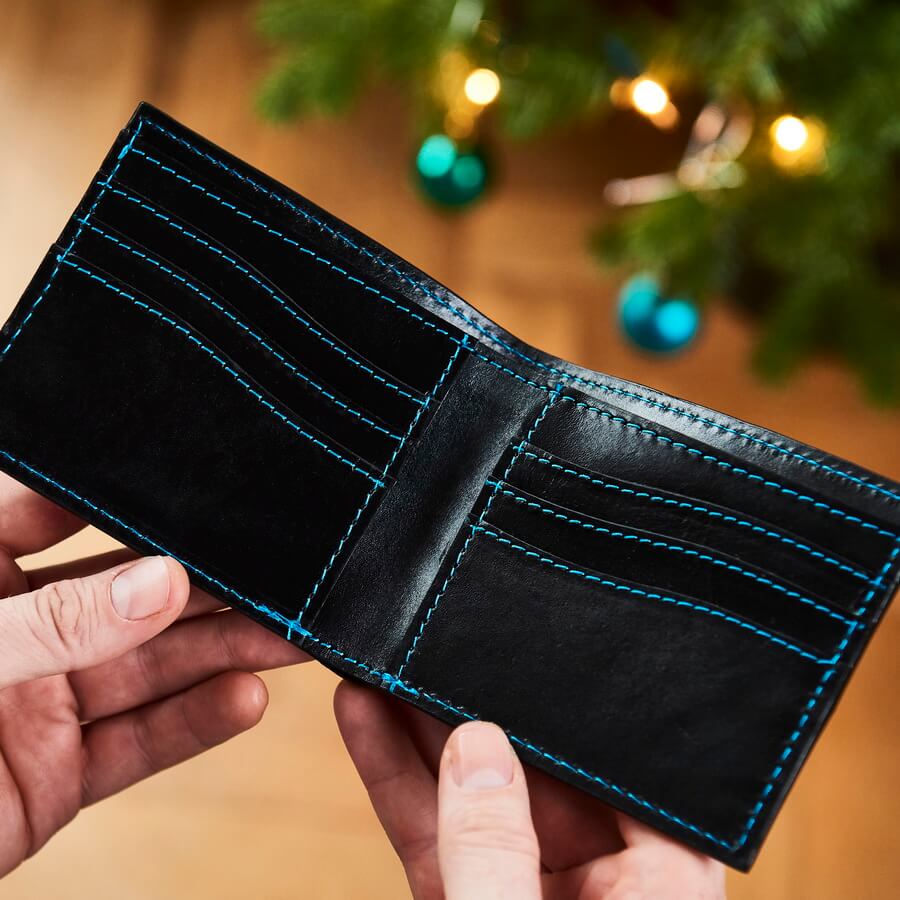 This handmade leather wallet is the perfect present for any stylish gent who enjoys handmade quality and beautiful leather. The contrast stitching adds a point of difference but if you'd prefer a more classic black or tan wallet thats an option too!