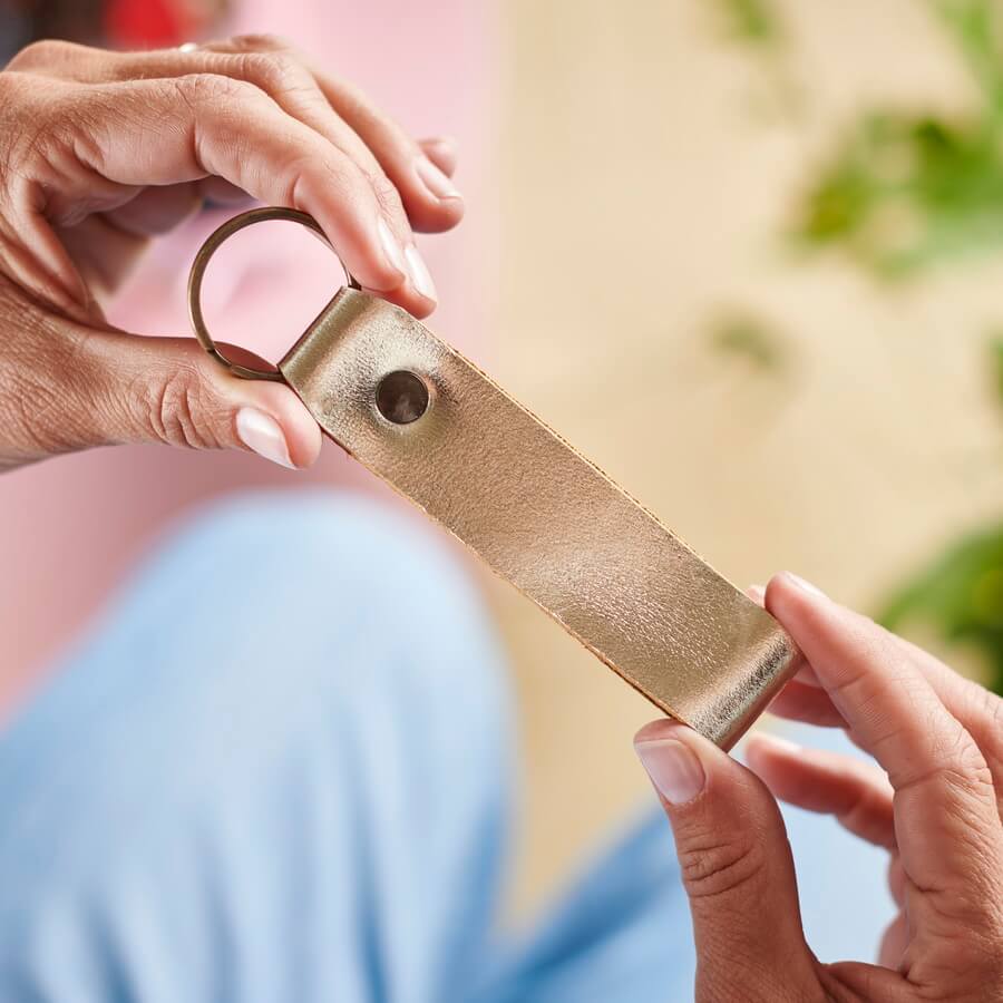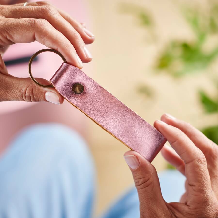 Our leather key rings are available in gold, metallic pink, tan and black buffalo leather.