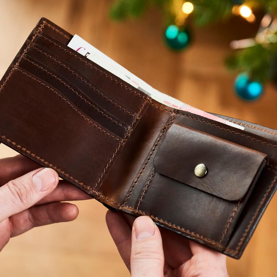 This handmade leather wallet is the perfect personalised gift for any man who enjoys expertly, handmade quality and beautiful leather. It can hold cards, notes and coins too!