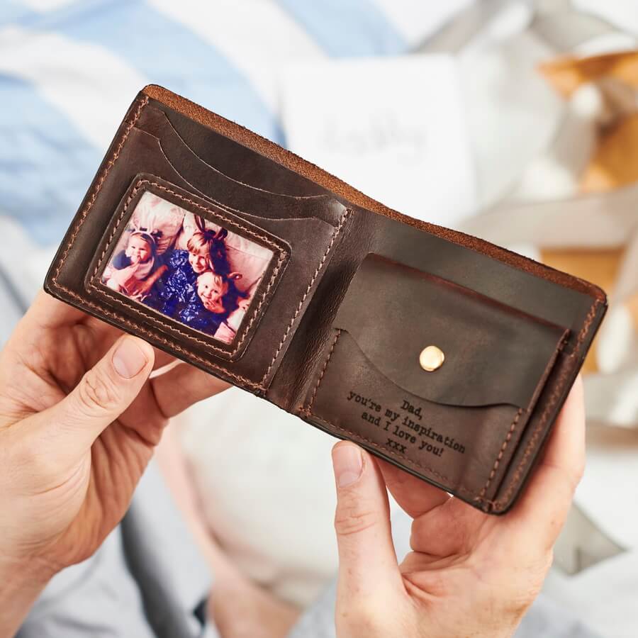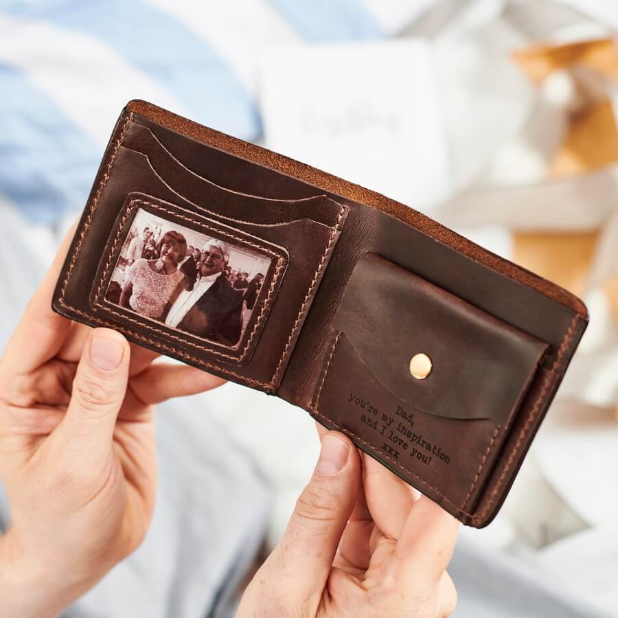 The wallet comes with a photo card,  just attach your favourite photo to your order and we'll print it onto a metal card and inset into the wallet.