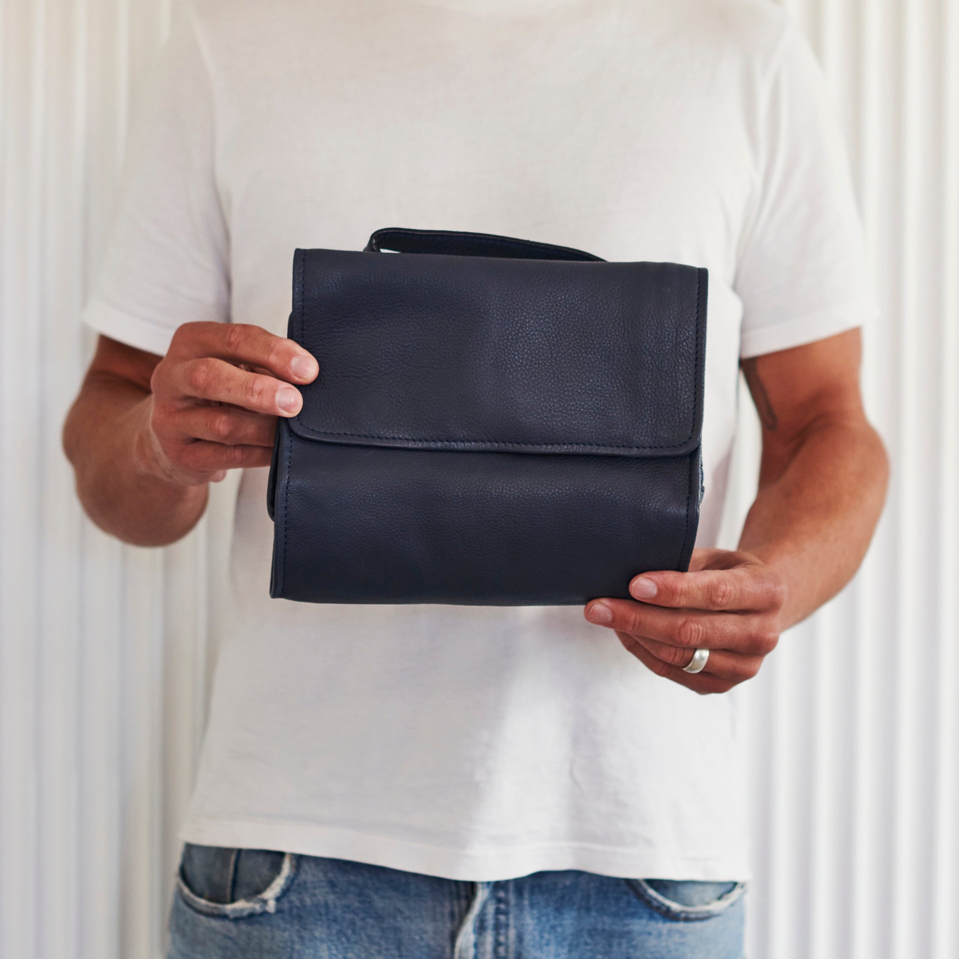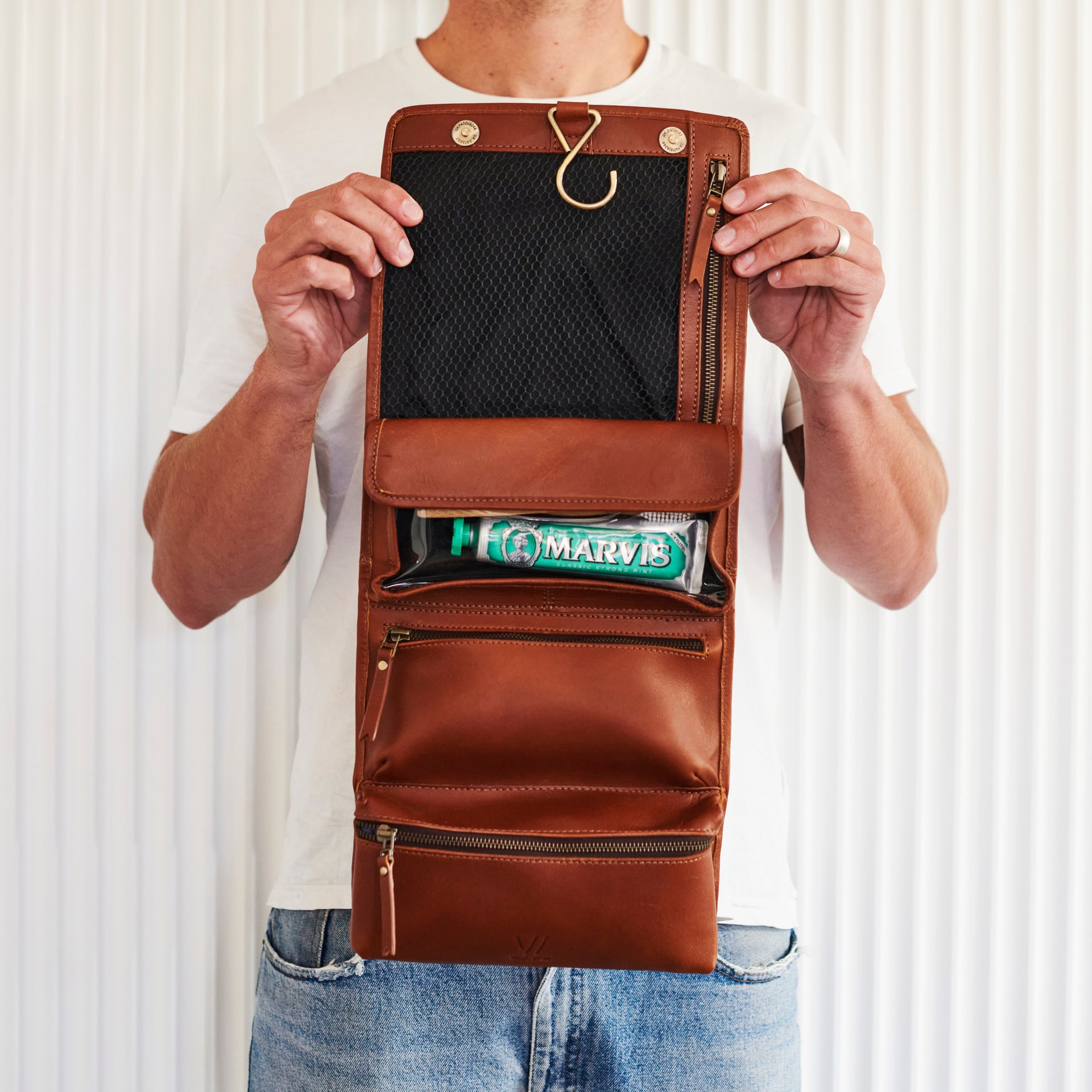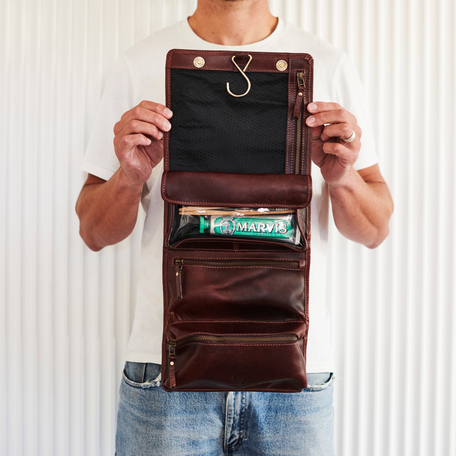 Our handmade men's leather hanging wash bag is one for the true travel connoisseurs.