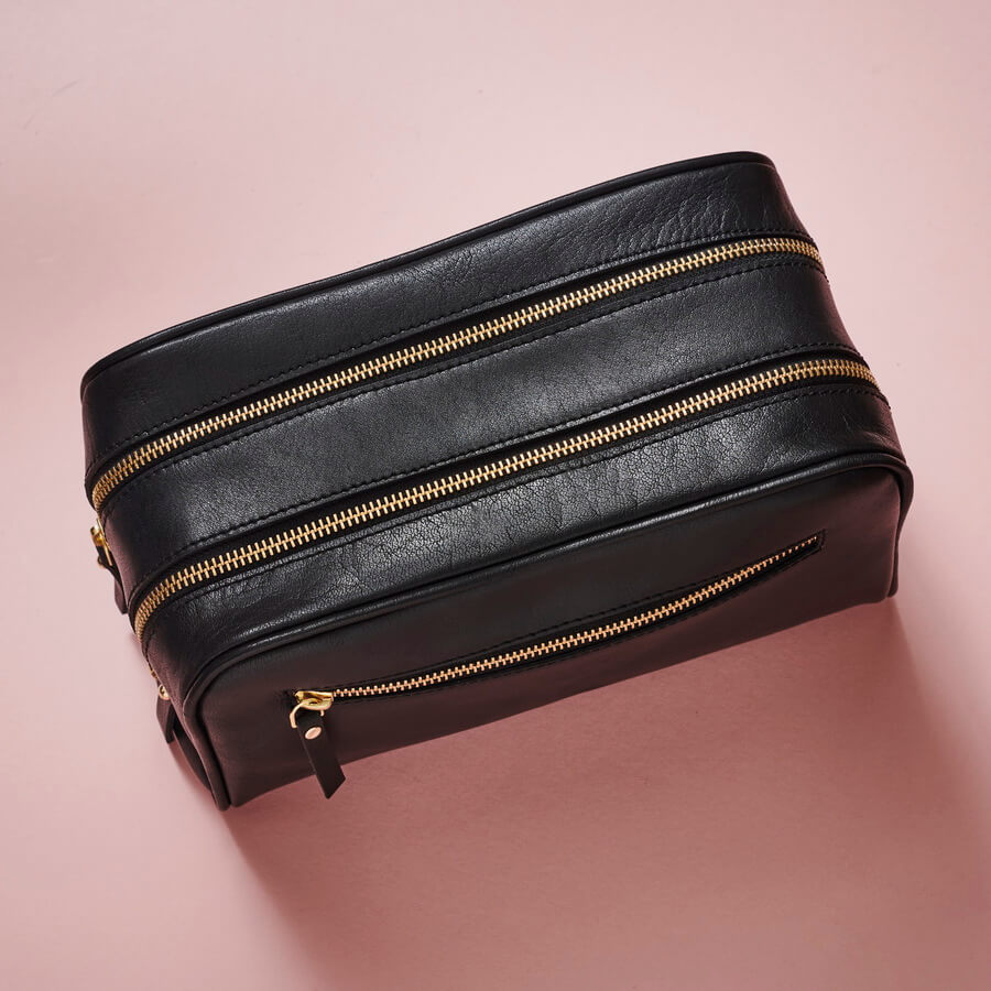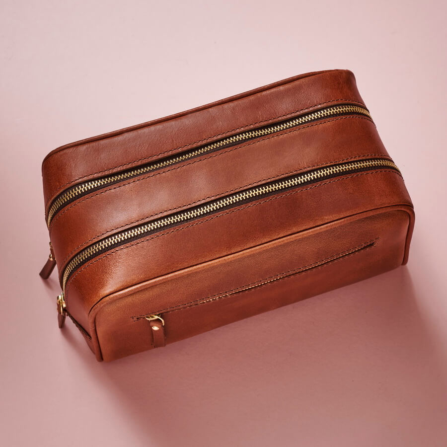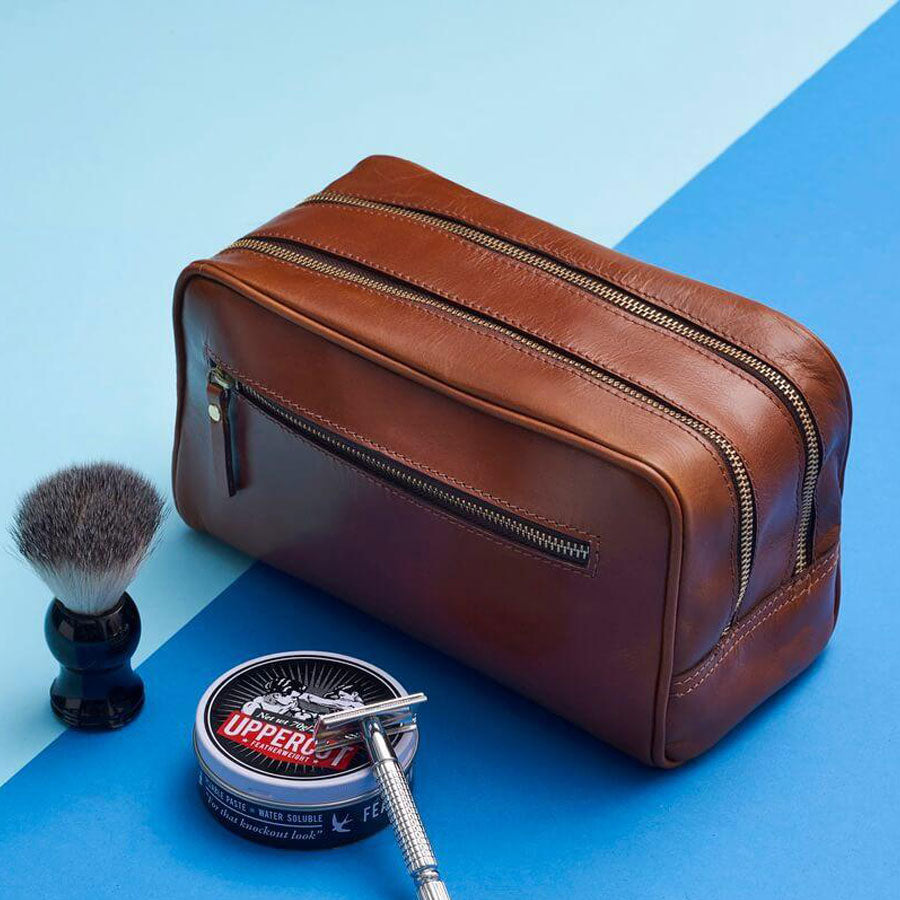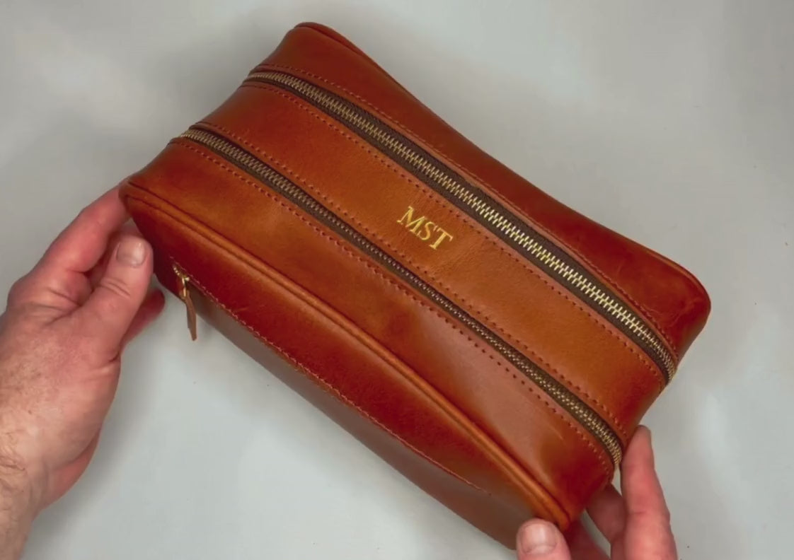 This handmade leather wash bag has 2 separate sections and a zip pocket on front too, making it easy to keep your toiletries sorted. It is luxurious and functional and makes a great gift for any man with taste!