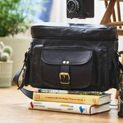 This handmade black leather camera bag stores your digital or 35mm film camera securely whilst travelling or wandering the streets looking for that next great shot.