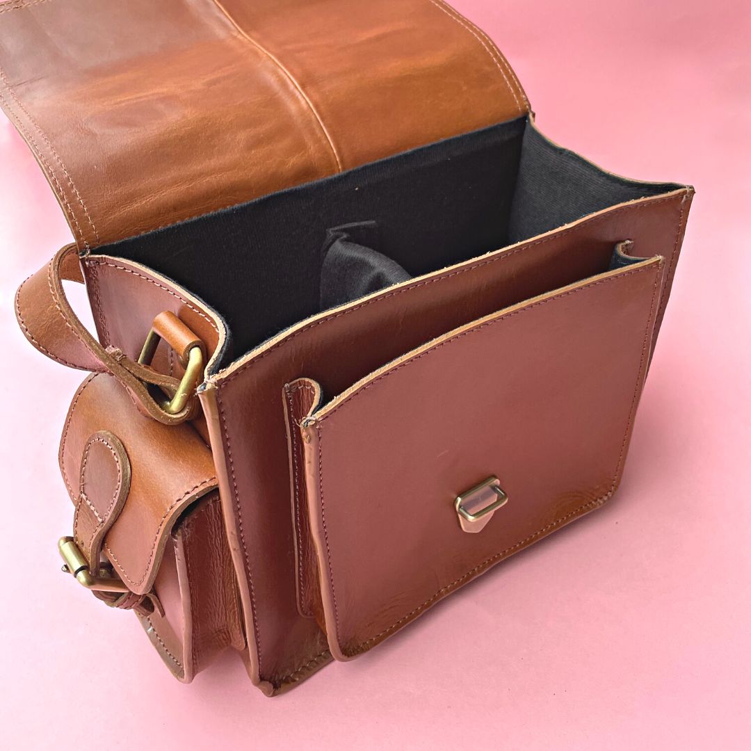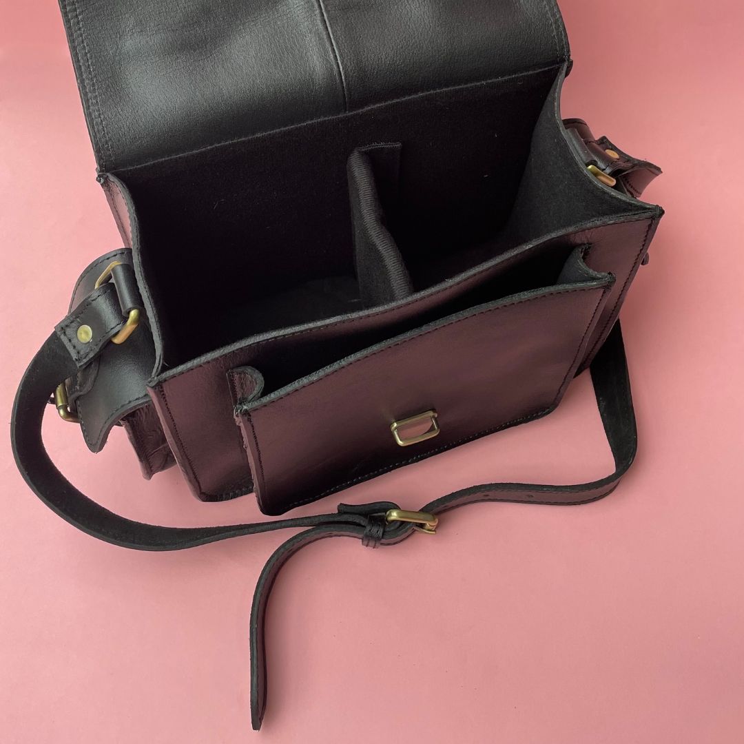Each camera bag has been handmade to last a lifetime from the finest buffalo leather, which will age beautifully. Inside there is the classic padded sides and a removable middle divider so that the bag can be used for normal use if you're not using it for your camera.