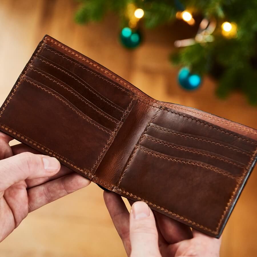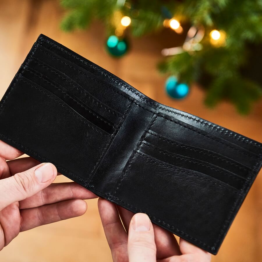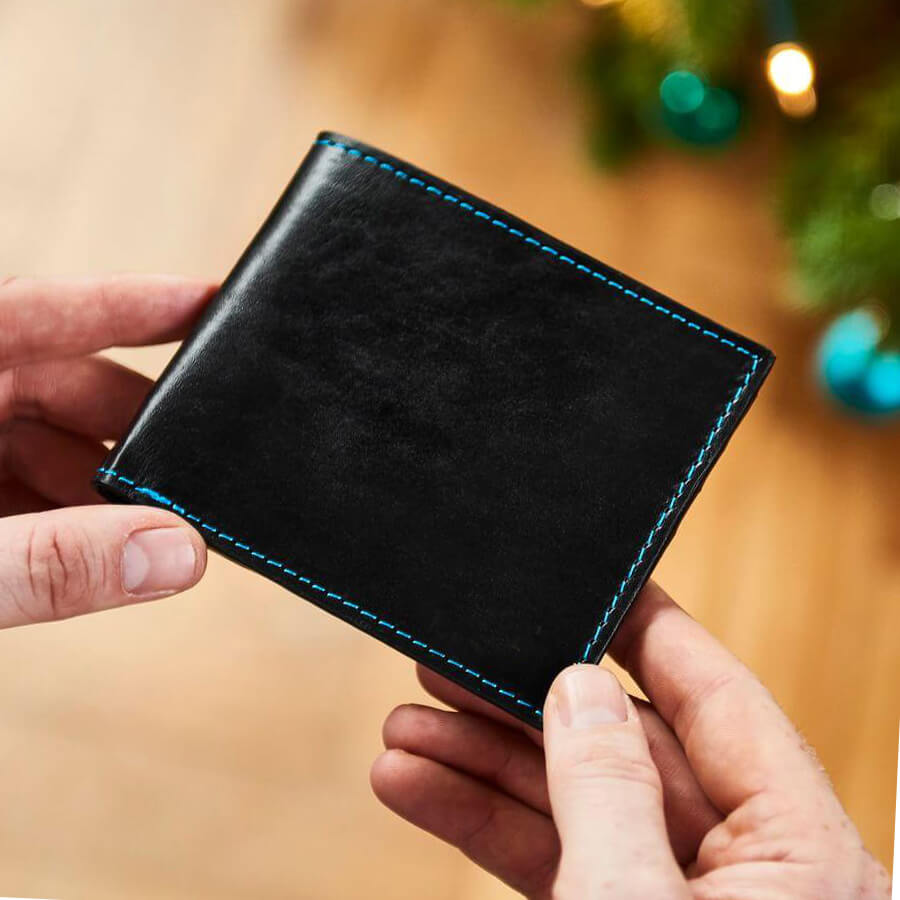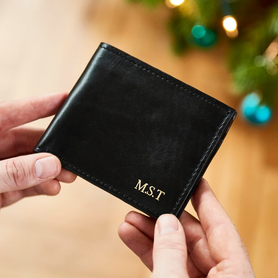 The personalisation options takes this leather wallet up into the gift stratosphere. We can hot-stamp gold or just plain embossed initials or a name on the outside front of the wallet.