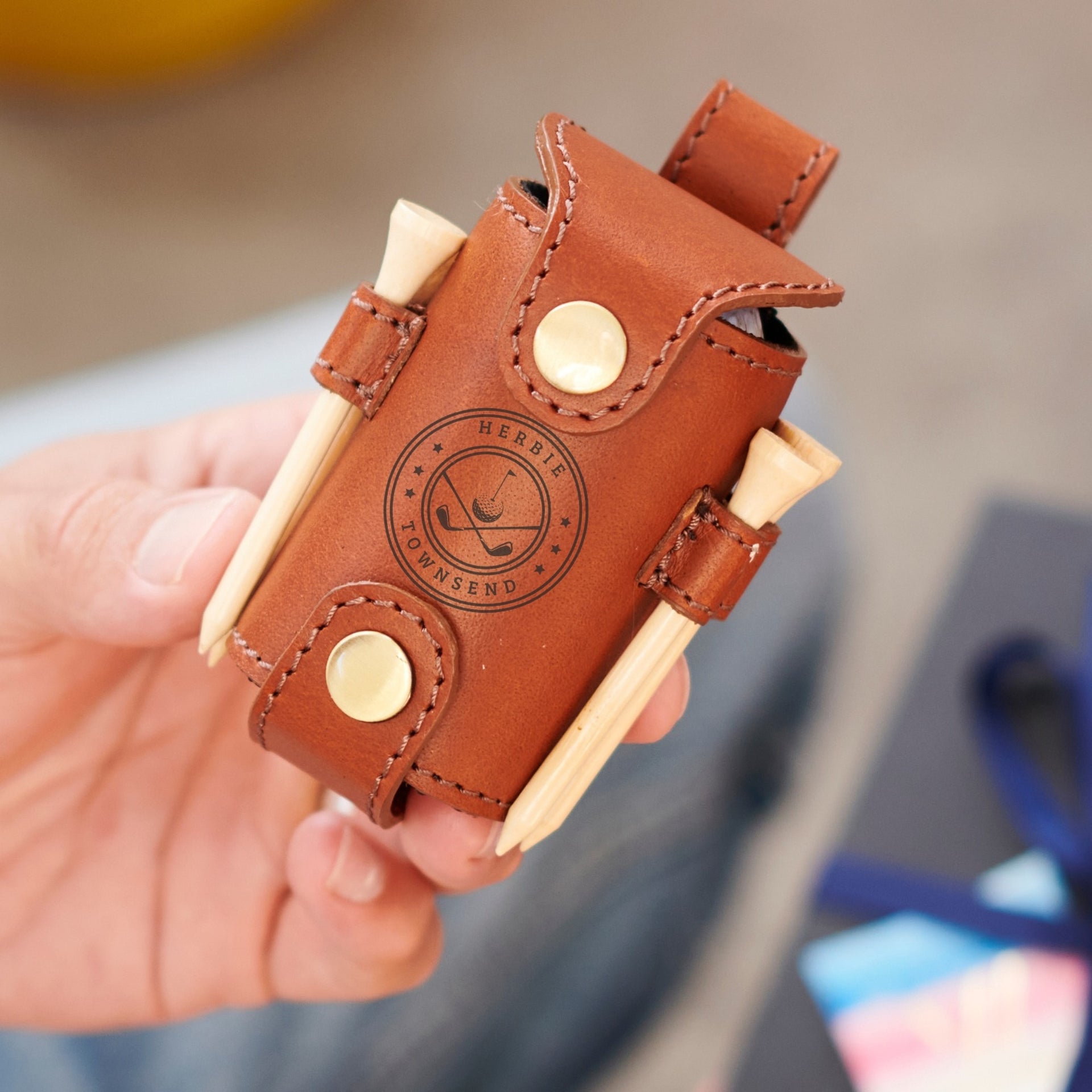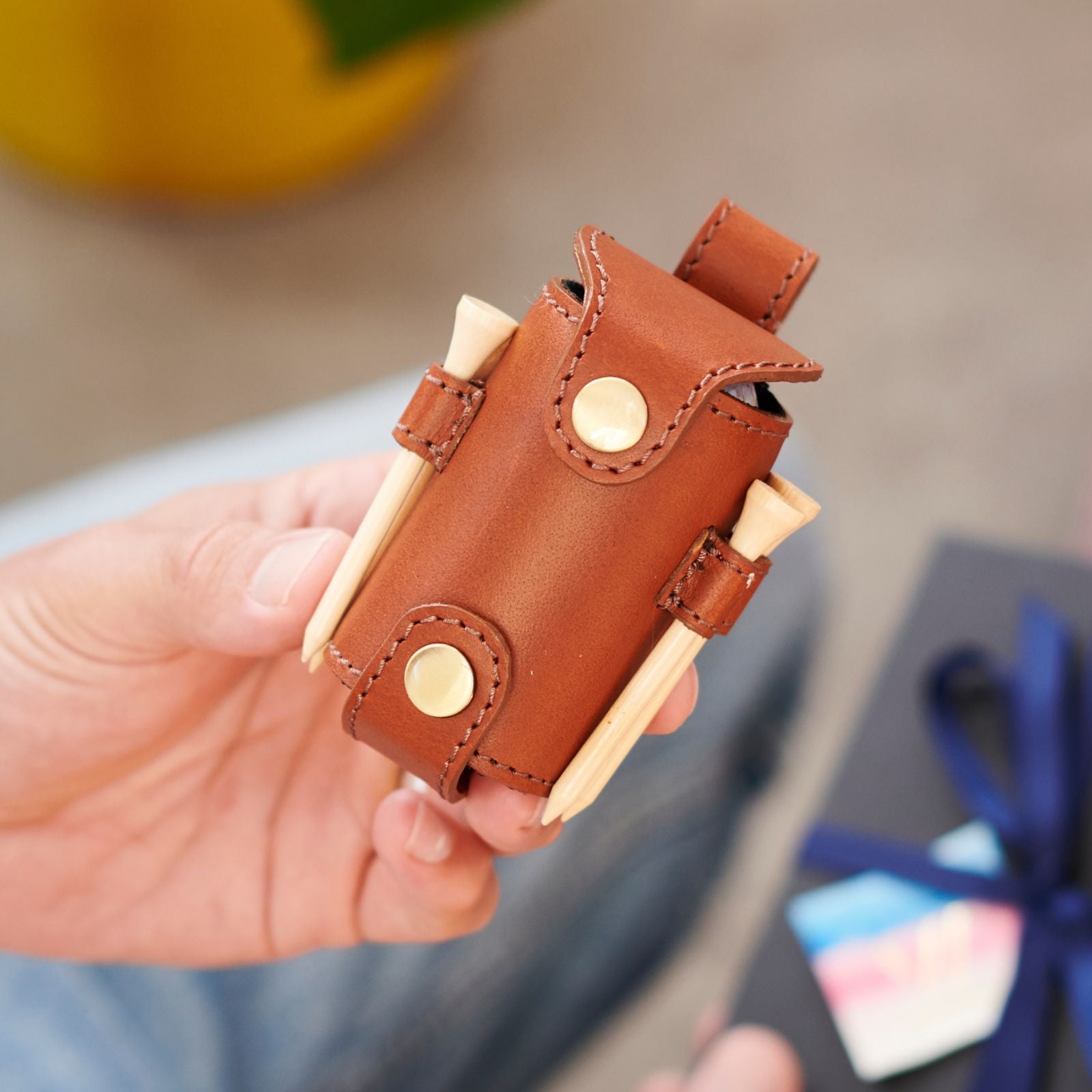 A memorable Christmas gift for any golfer, this handmade leather golf ball holder keeps golf balls close at hand while adding a touch of style to the course.