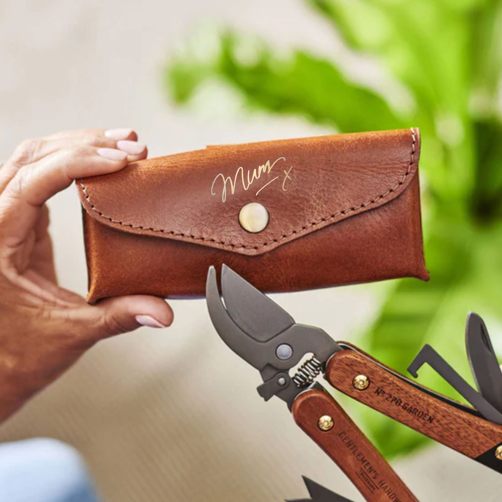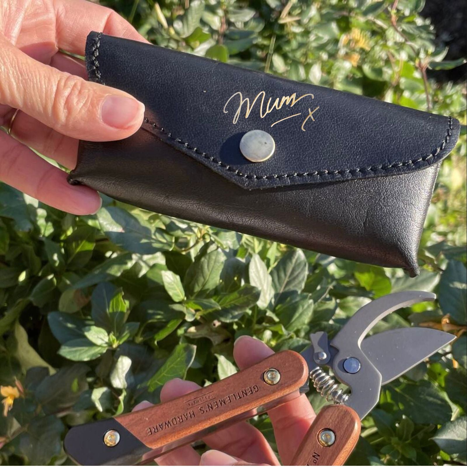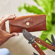 We hand-make the gardening tool holder using hard-wearing, protective buffalo leather - it's tactile, tough and will just get better and better with use. This comes with our handwritten style Mum x embossed in gold.