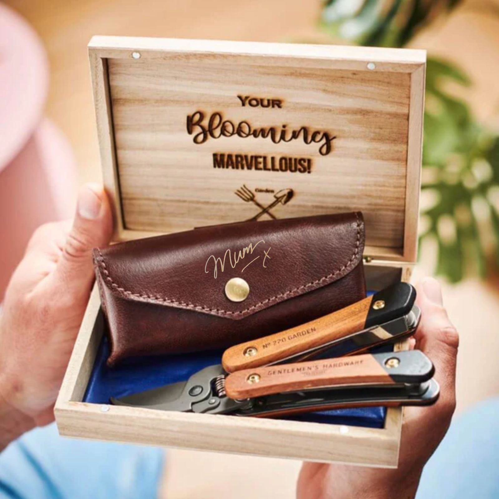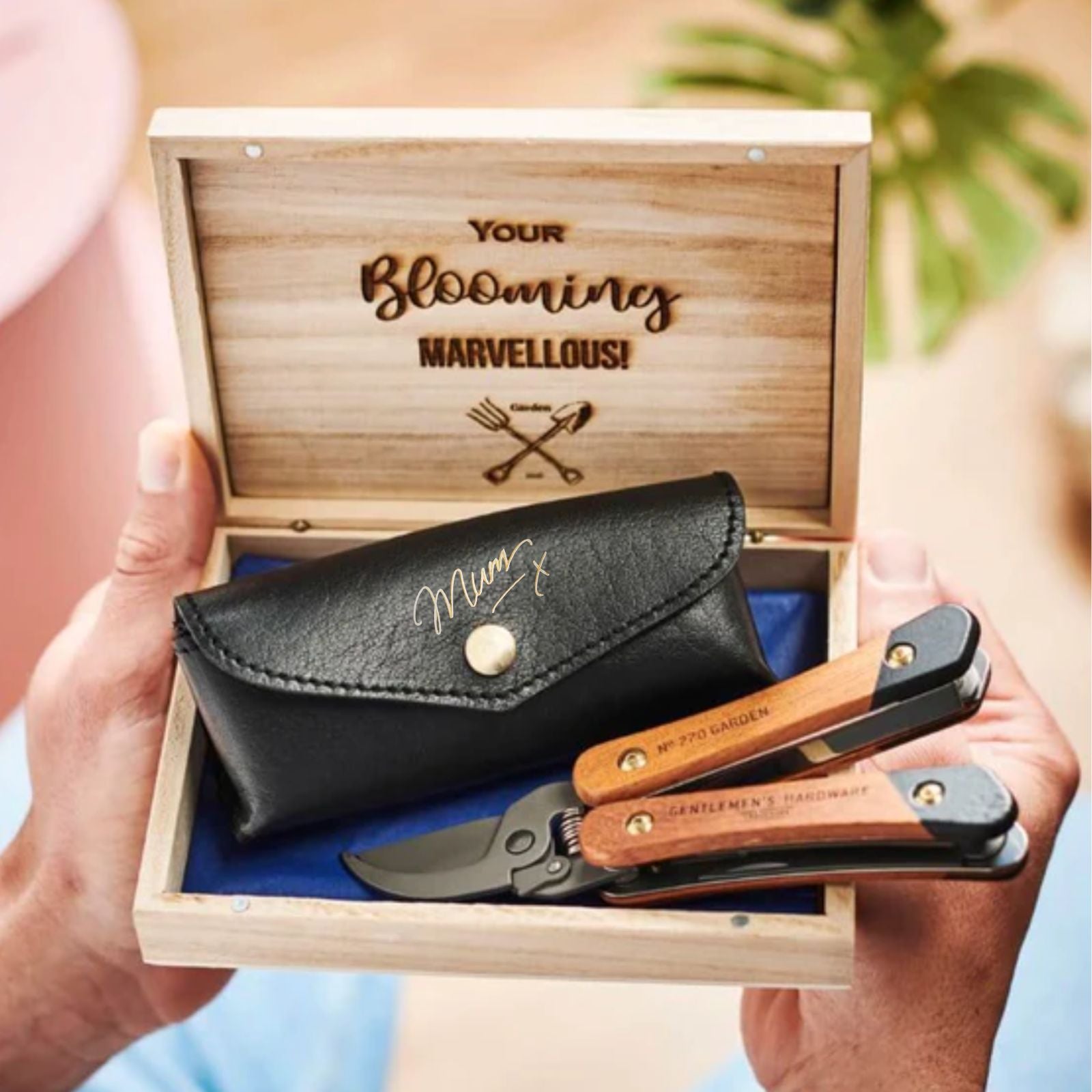 Mum Gardening Gift Box with Personalised Leather Holder and Gardening Tool