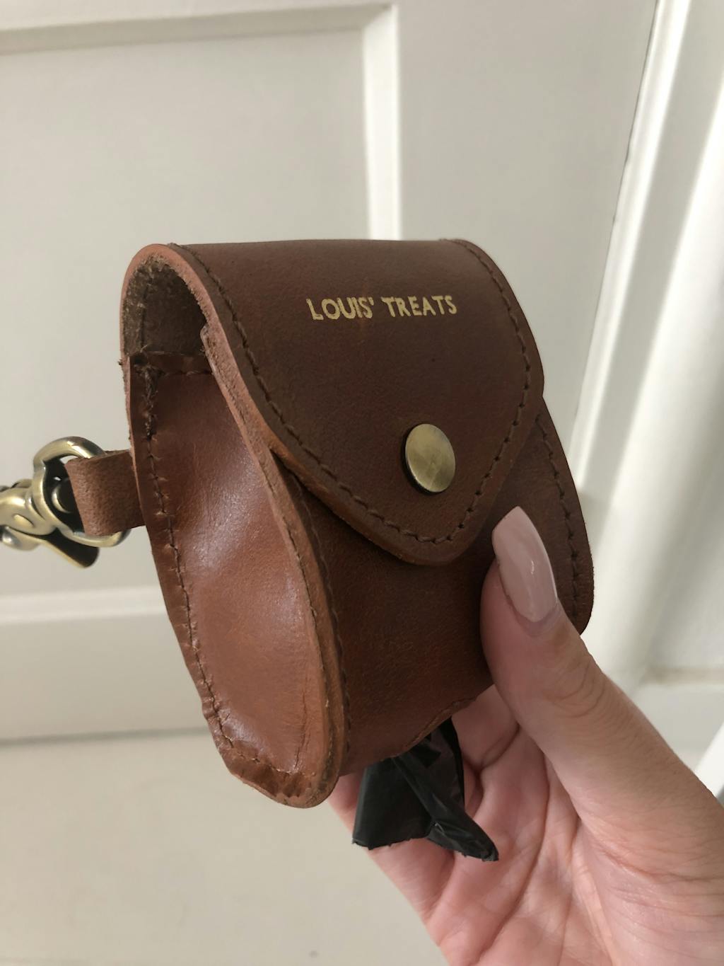 Made with rugged buffalo leather, this handmade treat bag will only improve with use. Available colours include dark tan (as seen in the main image), dark brown, black, navy or blush pink.