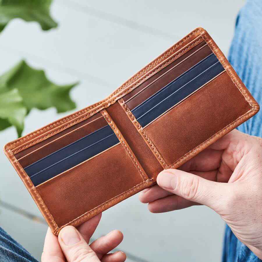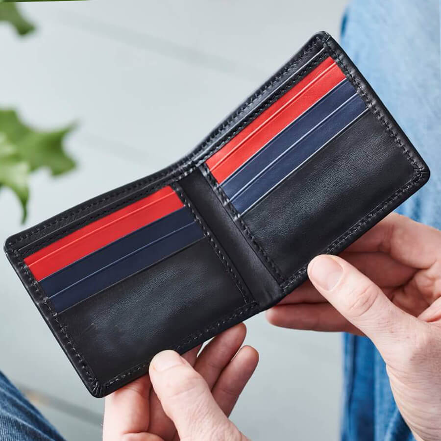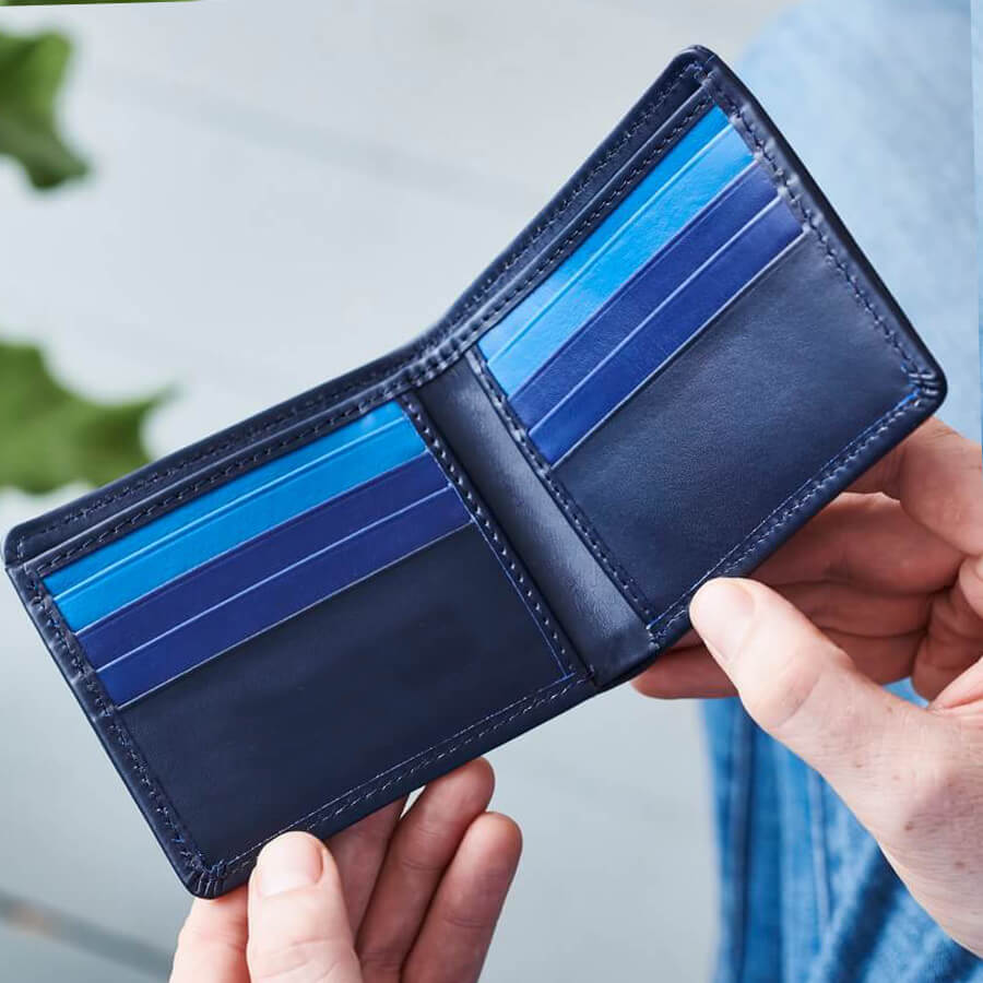 This men's leather wallet feels wonderful in the hand and is a pleasure to use. The contrast of different coloured leather on the inside makes this wallet on trend too!