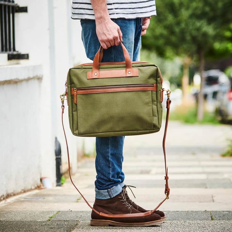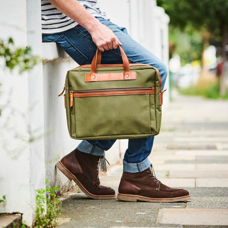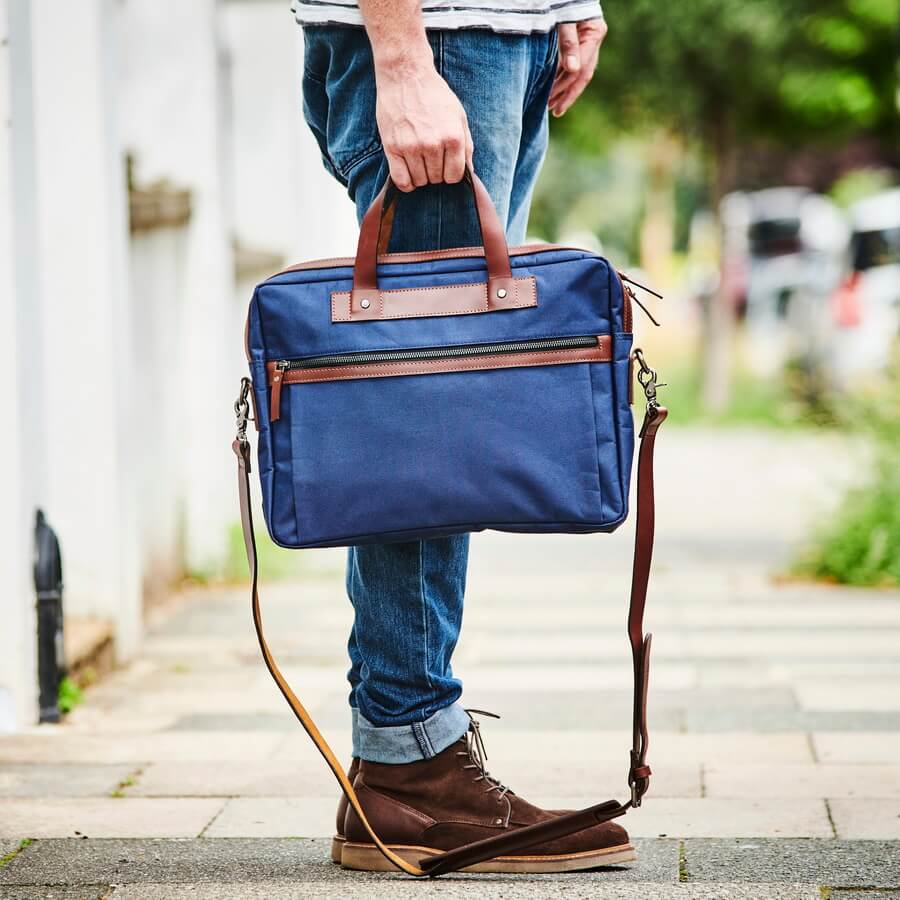 We hand-make these laptop bags in navy with dark brown leather, black with black leather and olive with tan leather.