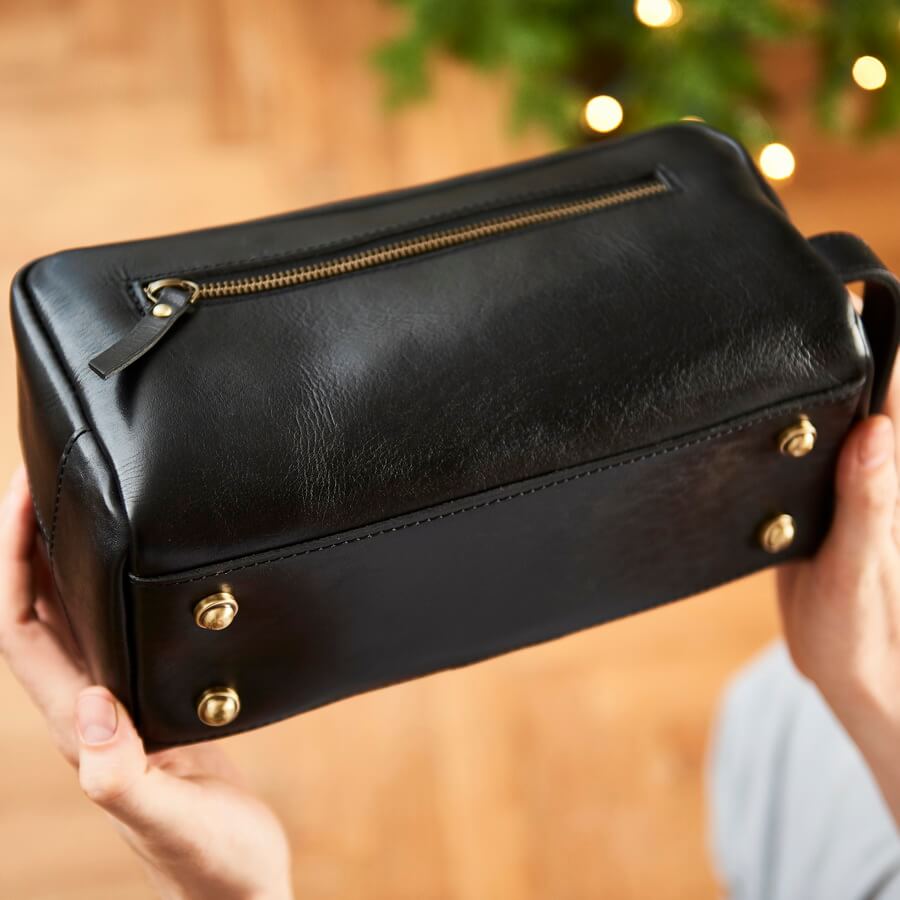 This is our ultimate luxury wash bag complete with metal feet on the bottom. Add some initials in gold for perfect gift for any special man.
