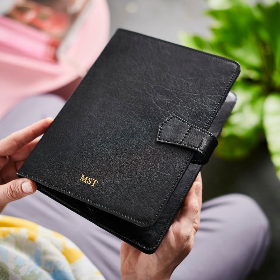 Perfectly sized for iPad 1, 2, and iPad Air, and handcrafted by skilled artisans in our workshop, you can trust in its high quality. Personalise this cover with initials, name, or a short message in vintage gold, matte black, or blind (heat only) for a thoughtful gift or a cherished item for yourself.