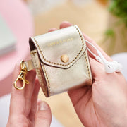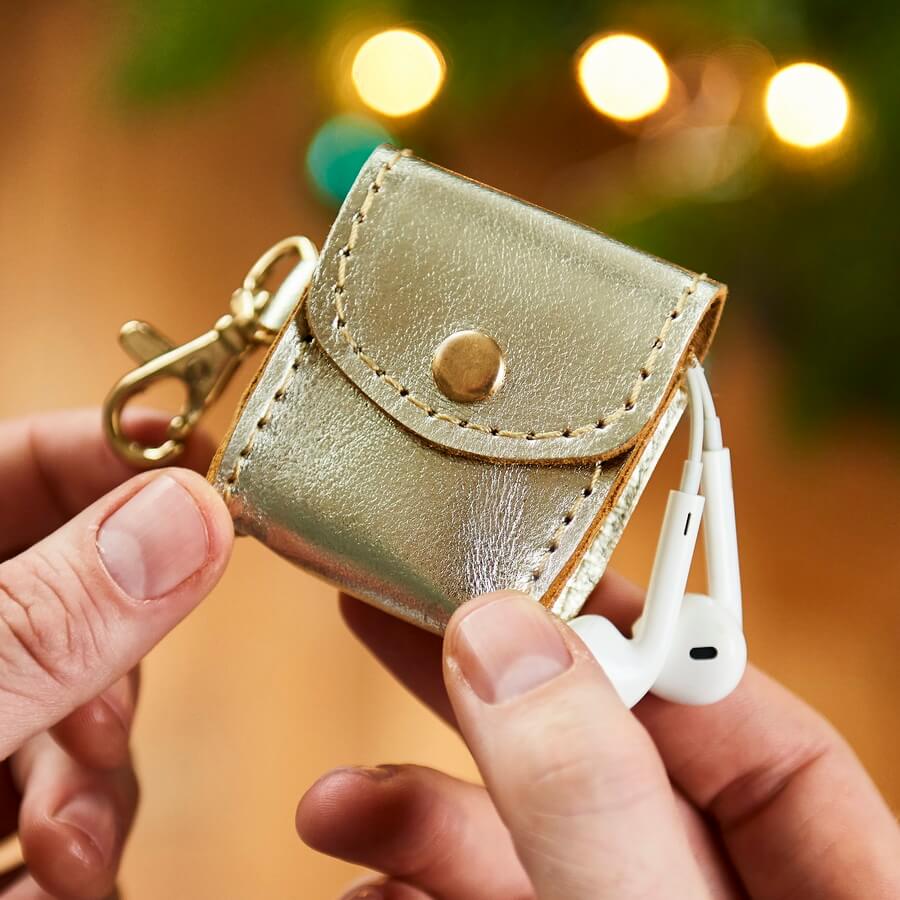 It comes in a selection of leather colours tan, black, navy, gold and metallic pink.It comes in a choice of sizes so you can fit your Air Pods charger in too if you need.