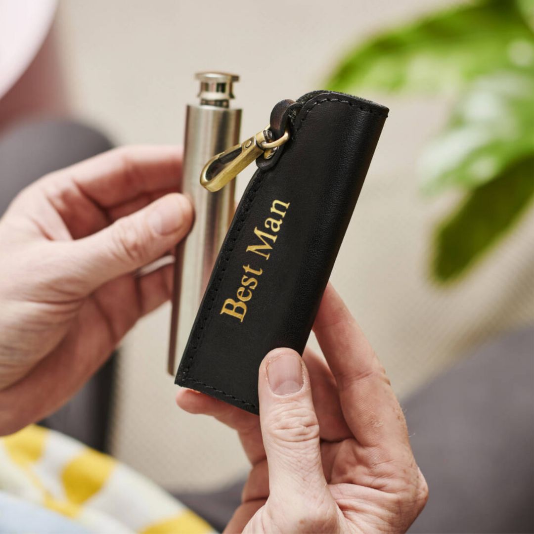 This handmade leather holder keeps a very handy stainless steel hip flask close at hand - perfect to calm Wedding pre-speech nerves.