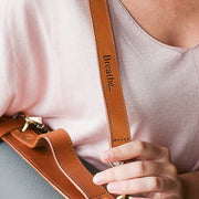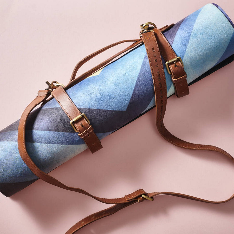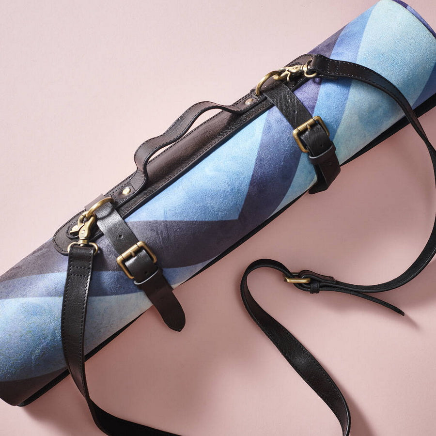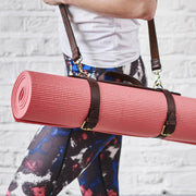 Our functional design keeps things simple - hardwearing buffalo leather, hand-crafted into a shoulder strap so that a yoga mat can be held tightly by the buckle straps and then comfortably worn across the body.