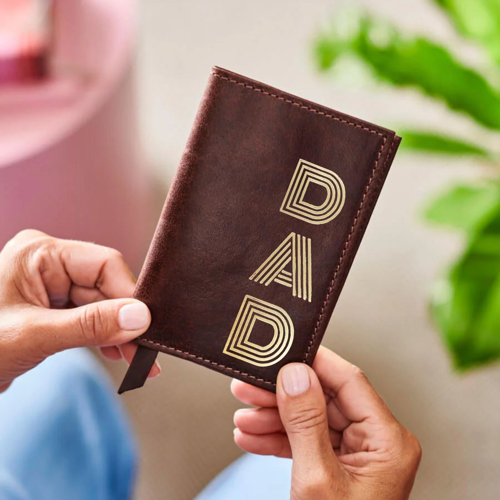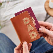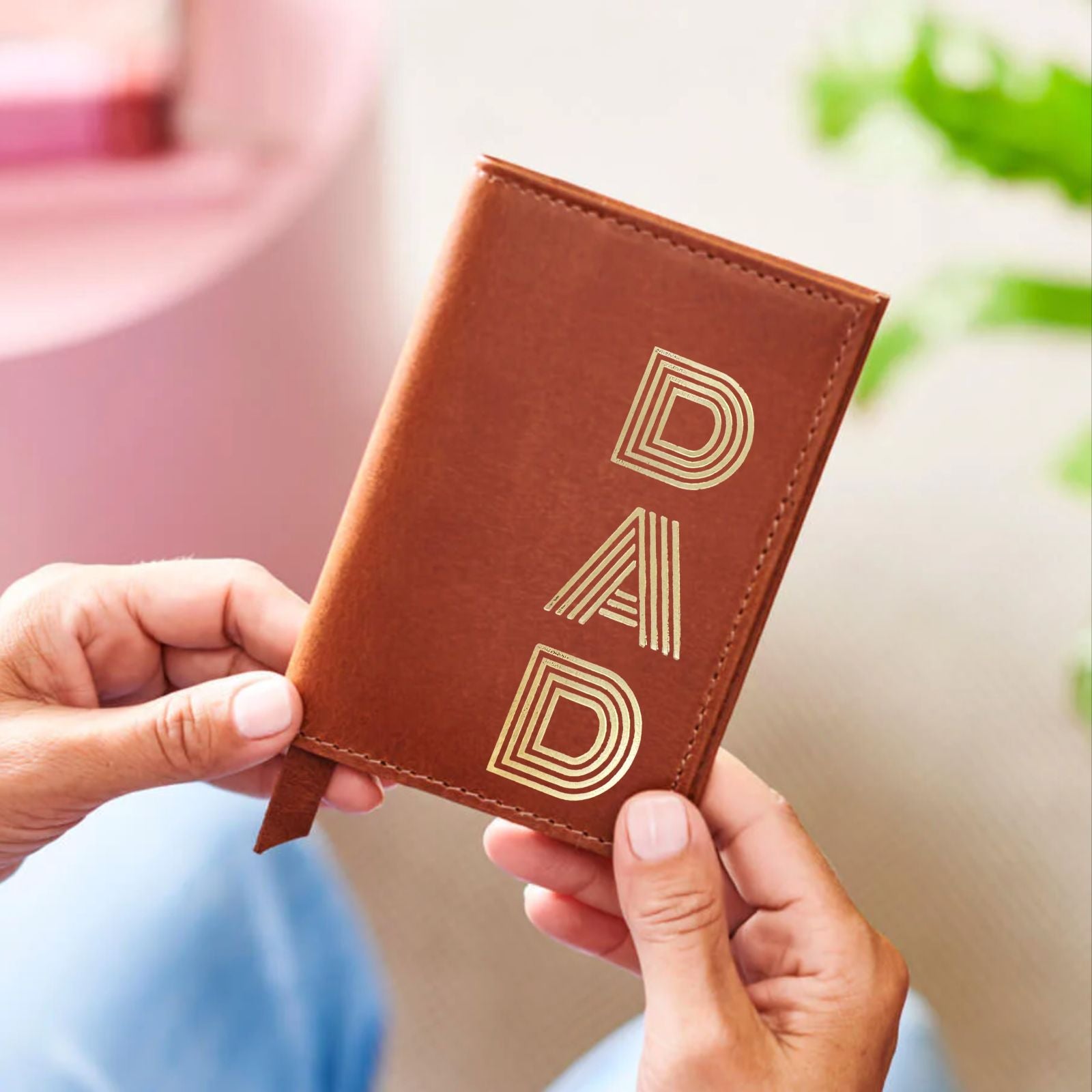 This handmade leather passport cover embossed with gold Dad is the perfect gift for Father's Day.