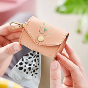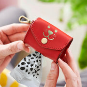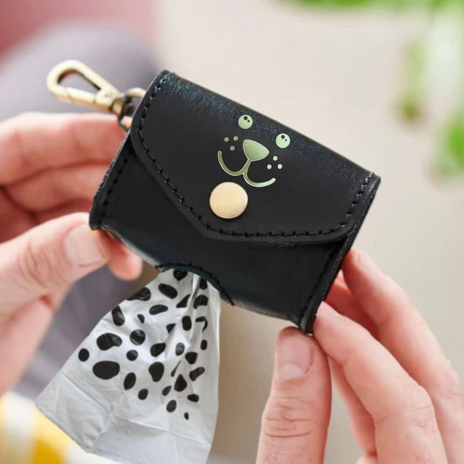The leather bag simply clips on to a belt loop or bag so you can have quick and easy access to doggy poop bags. Comes with a roll of funky dog poo bags.