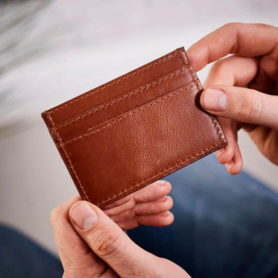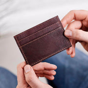 We have handmade this card holder using hardwearing, distressed buffalo leather and a simple, functional design, which will keep your cards safe. It has 2 slots on either side (both of which can hold multiple cards and a gap in the middle which you can also fold notes into it, making it an extremely slim-fit wallet.