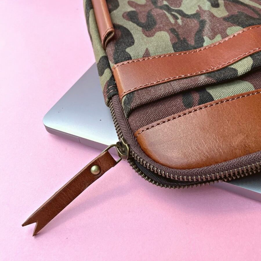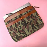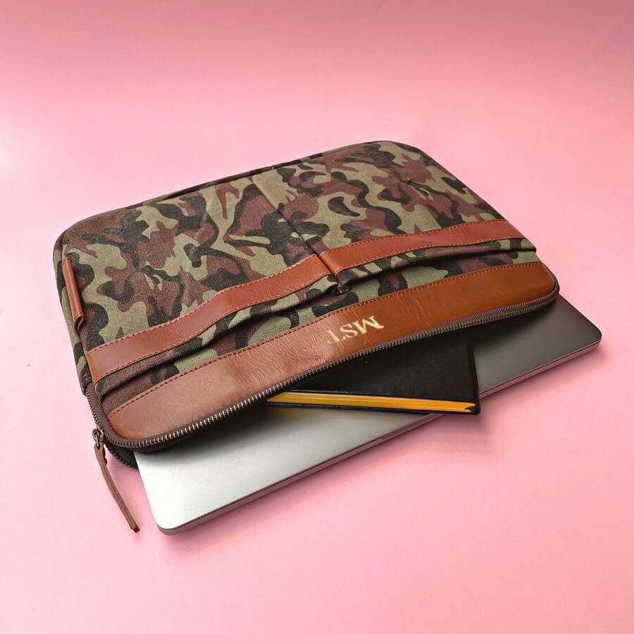 This handmade, zip-up nylon and leather case in funky camo canvas is perfect for keeping your laptop safe. We can personalise it too to create an incredible present!