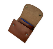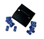 A handmade leather cover houses a very smart set of Ridley's blue dominoes.